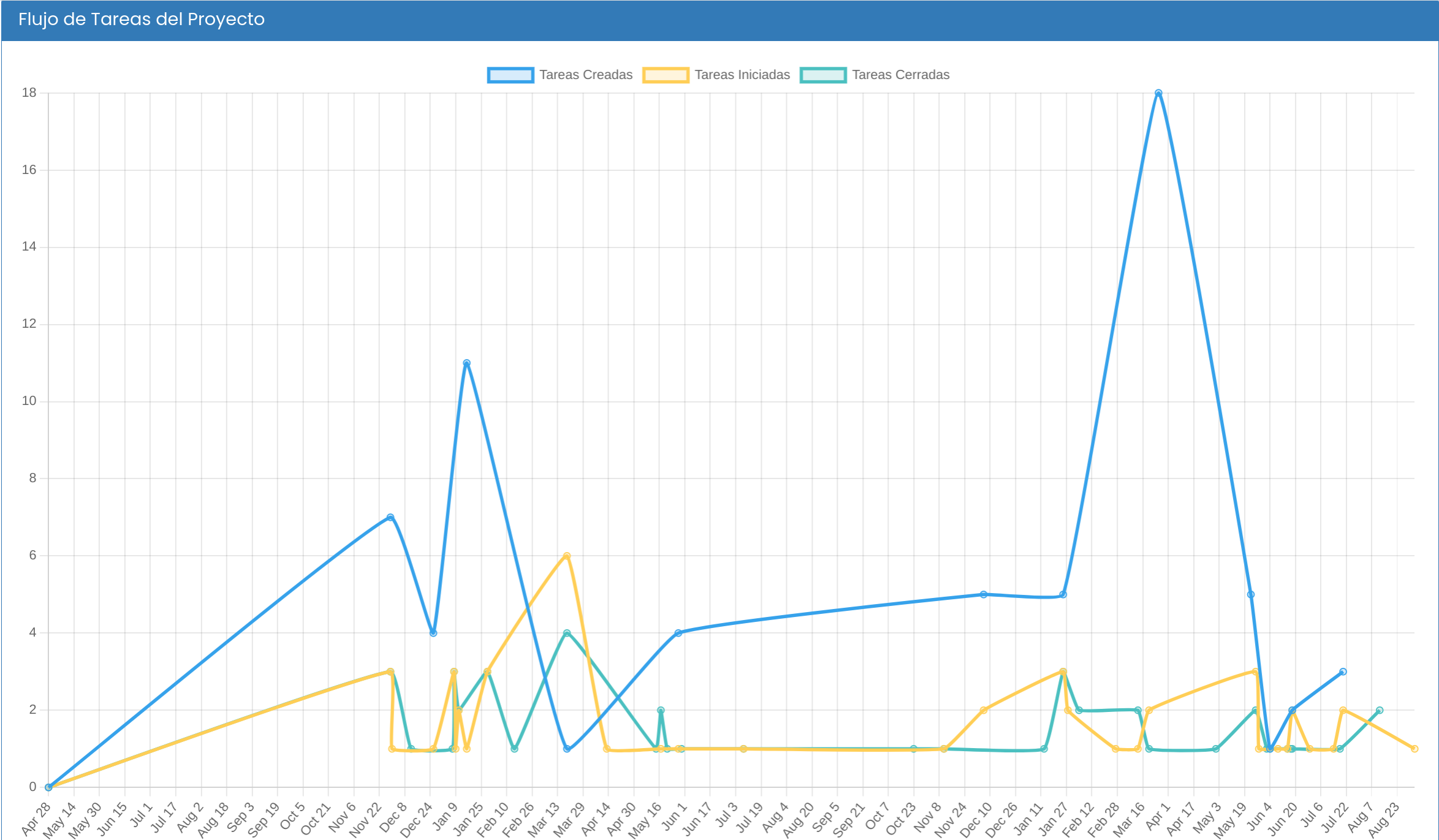 - Cuello de Botella: Si la línea de "Iniciadas" sube constantemente pero la de "Cerradas" se mantiene plana, su equipo está acumulando trabajo sin poder finalizarlo.